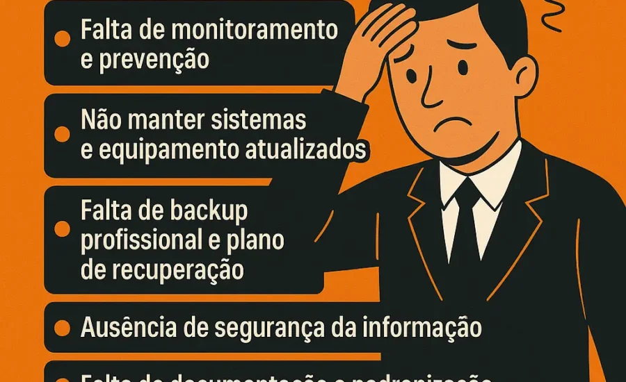 A gestão de TI é responsável por manter a empresa funcionando de forma segura, produtiva e estável. Porém, quando processos importantes são negligenciados, as falhas se acumulam e começam a gerar riscos sérios: lentidão, indisponibilidade, vulnerabilidades, perda